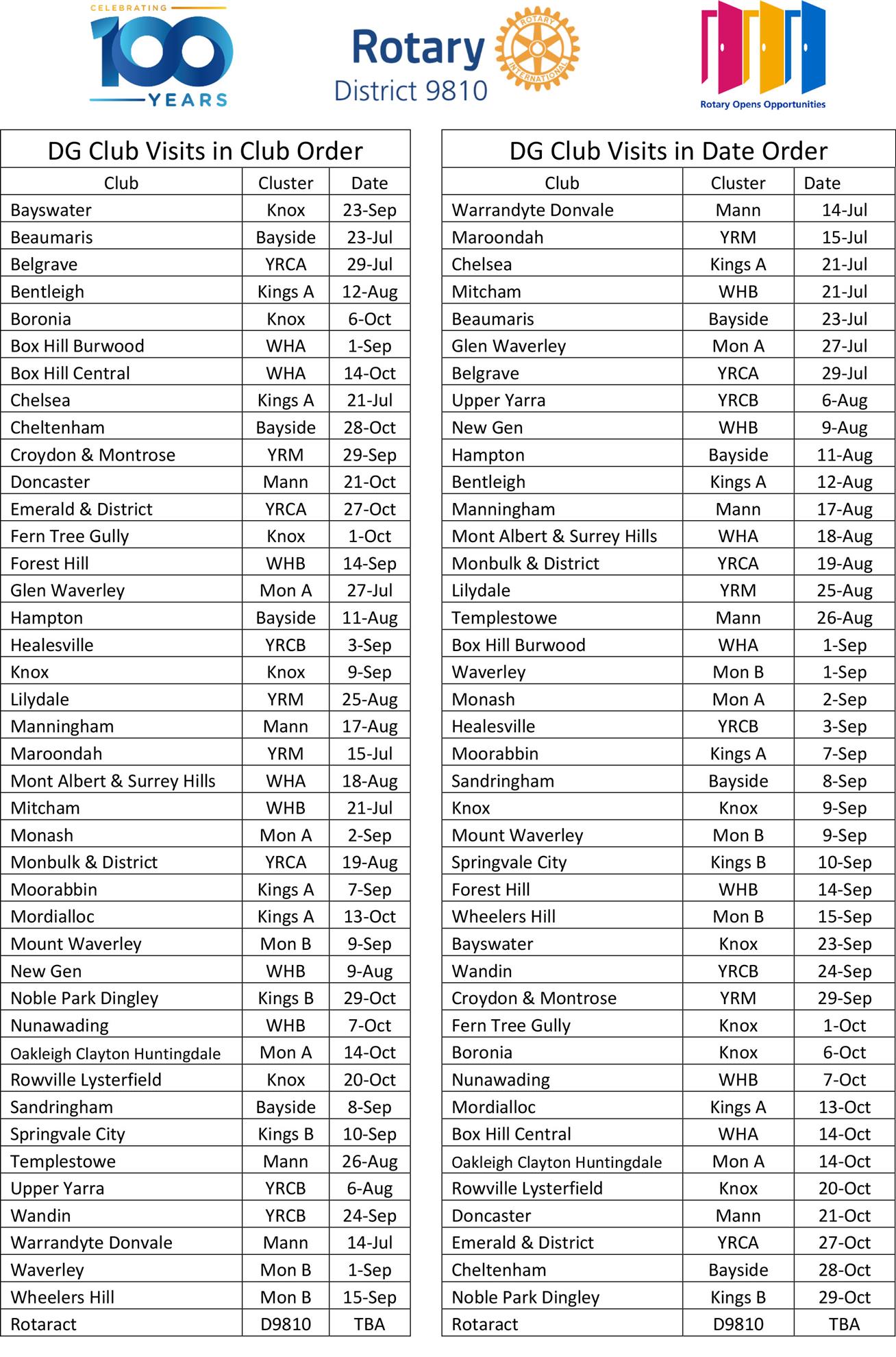 DG Club Visit Timetable